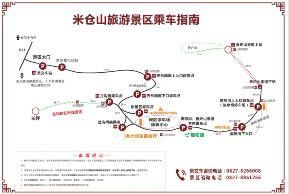 区间公交车:2024年10月1日至11月18日期间,光雾山桃园社区停车场、光雾山游客中心停车场、米仓山旅游景区停车场区间免费循环运行公交车,游客朋友均可乘坐。