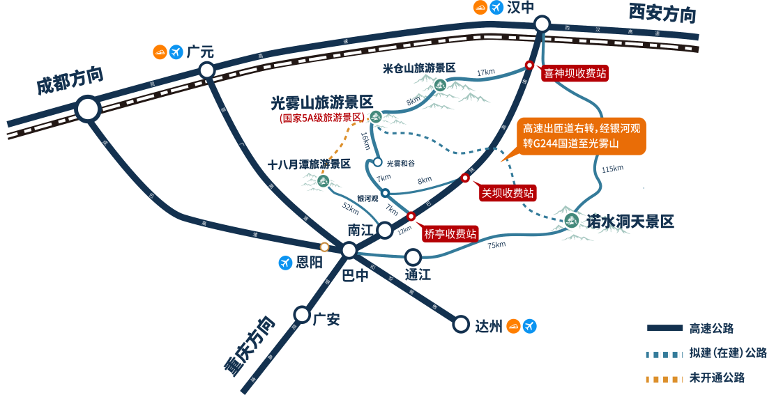 1.西安(西汉高速)—汉中(巴陕高速)一喜神坝(出高速口)一光雾山旅游景区、米仓山旅游景区