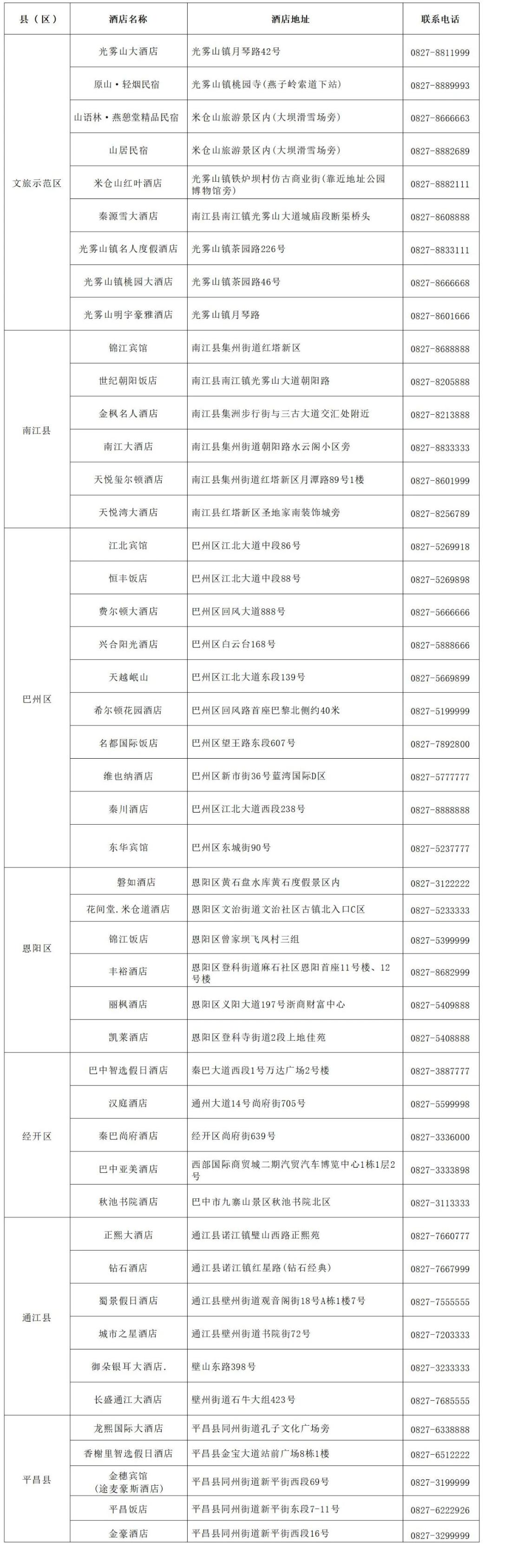 巴中市级各区县酒店一览表🔻
