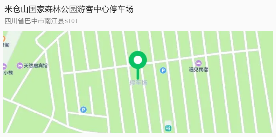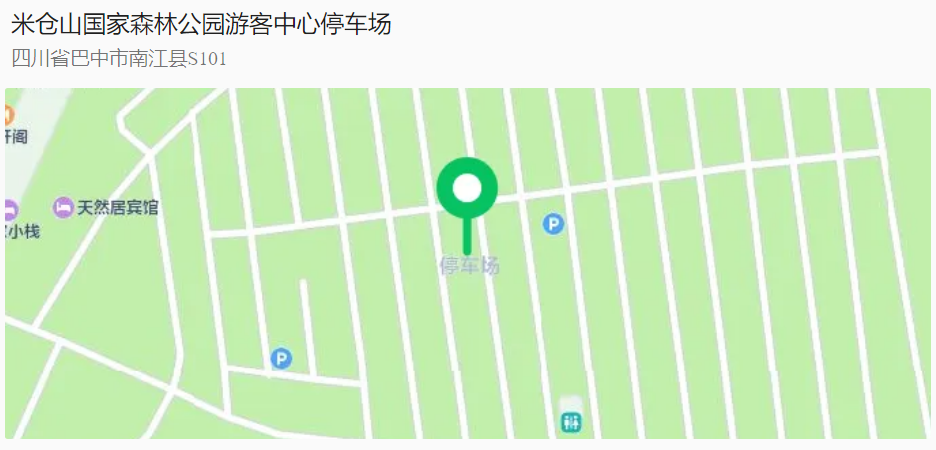 导航搜索:米仓山国家森林公园游客中心停车场、米仓山国家森林公园售票处(两个都可搜索,车开到后直接停车位,然后按指引入园)