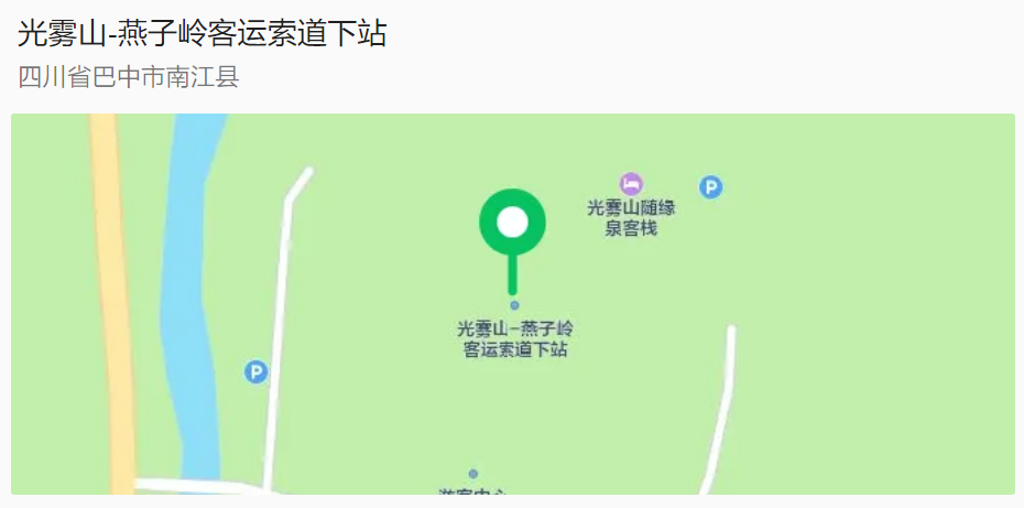 导航搜索:光雾山旅游景区咨询服务中心、光雾山燕子岭索道下站(两个都可以,如乘坐索道直达燕子岭请选择第二个,如徒步或者沿河游览请选择第一个)