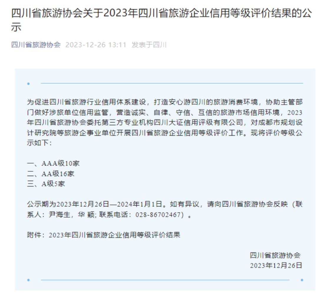 2023年12月26日,四川省旅游协会公示2023年四川省旅游企业信用等级评价结果。其中AAA级10家,AA级16家,A级5家。