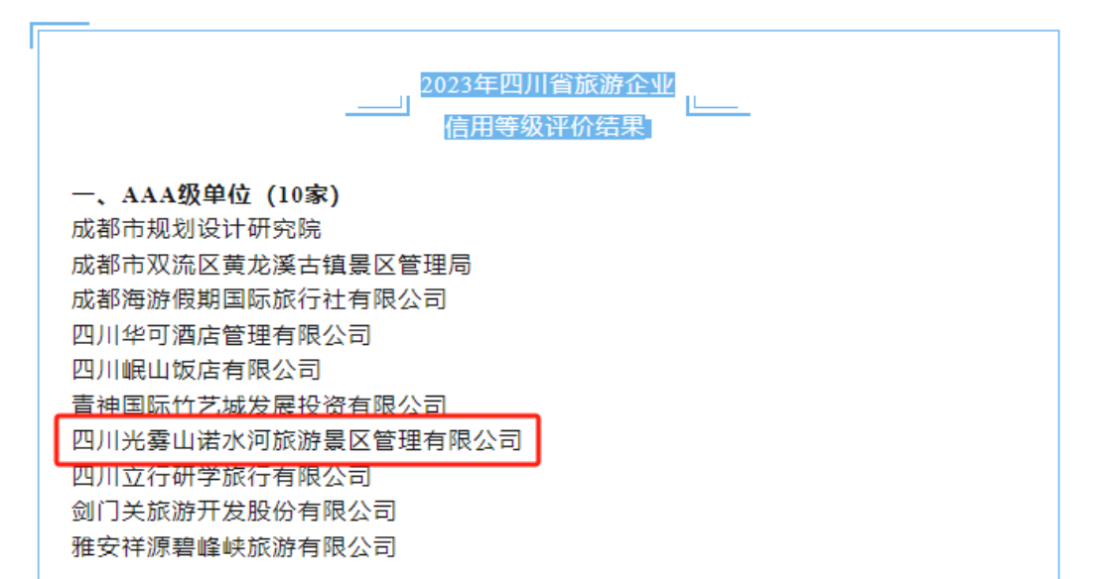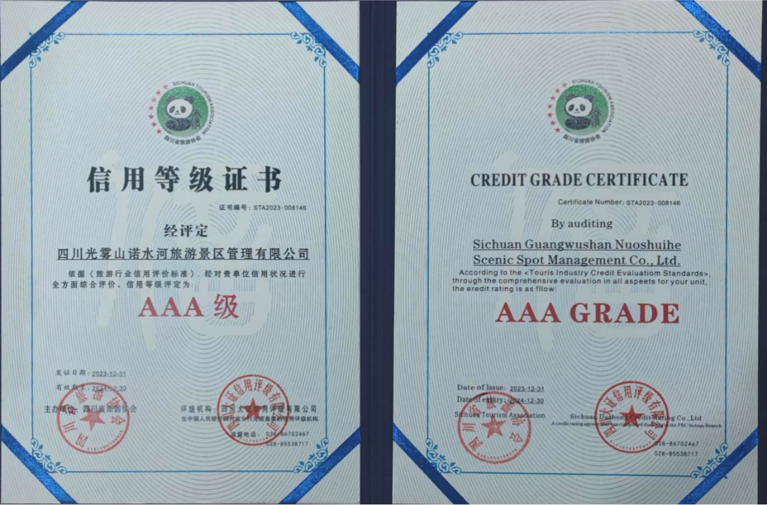 四川光雾山诺水河旅游景区管理有限公司荣获四川省旅游企业信用等级评价“AAA级”。