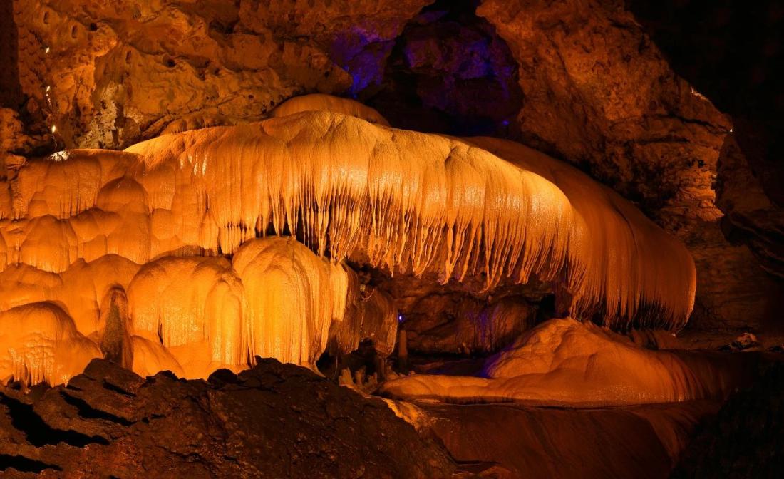 洞内瀑布、鹅管、石钟乳、石柱遍布