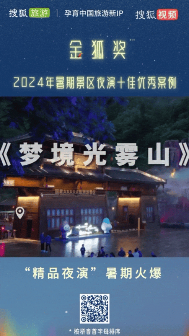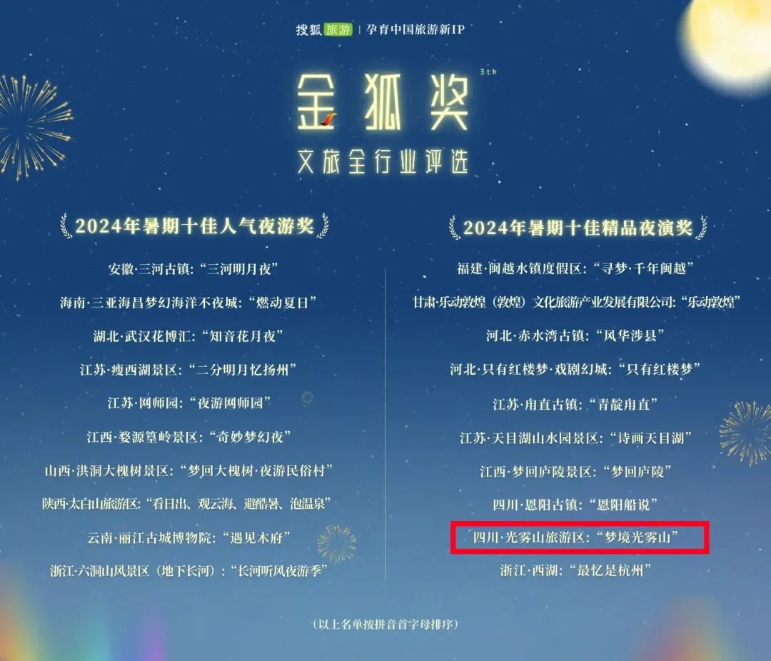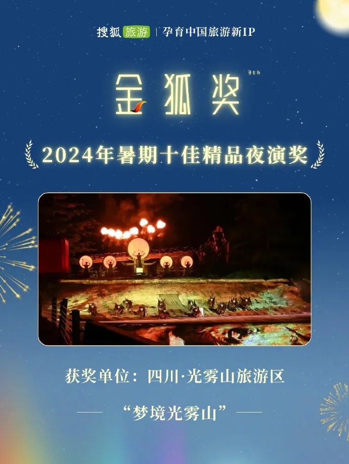 2024年暑期,搜狐旅游「金狐奖」继县域游优秀案例后,推出“2024年暑期十佳精品夜演奖”,《梦境光雾山》成功入选!这是《梦境光雾山》入选国家文旅部20个沉浸式文旅新业态示范案例后获得的又一殊誉。