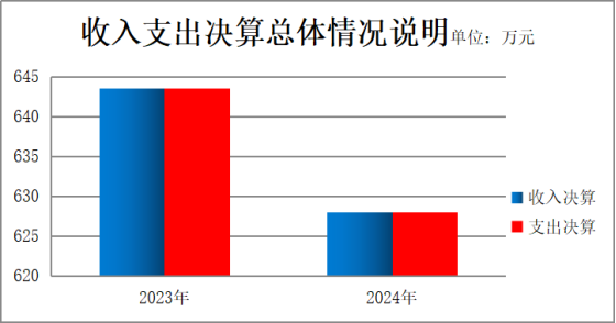 2024年度收入、支出总计均为627.95万元。与2023年度相比,收入、支出总计各减少15.60万元,下降2.42%。主要变动原因是: 2024年在职人员减少5人。