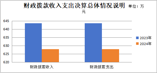 2024年度财政拨款收入、支出总计均为627.95万元。与2023年度相比,财政拨款收入总计、支出总计各减少15.60万元,下降2.42%。主要变动原因是: 2024年在职人员减少5人。