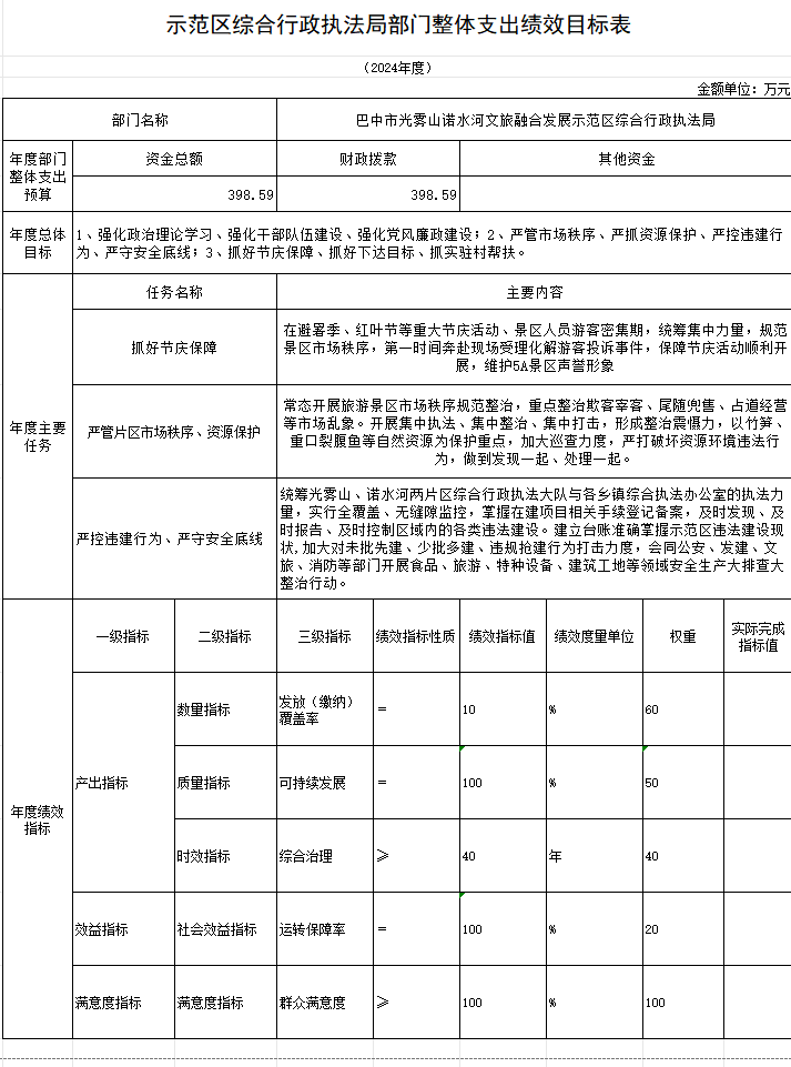组织对2024年度一般公共预算、政府性基金预算等全面开展绩效自评,形成巴中市光雾山诺水河文旅融合发展示范区综合行政执法局2024年度部门整体支出绩效自评报告、部门预算项目支出绩效自评报告,其中,2024年部门整体支出绩效自评得分为96.82分,绩效自评综述:2024年,我部门认真做好年度财政资金的绩效评价工作,在资金管理方面,进一步强化资金统筹,优化资金结构,明确开支范围,细化资金用途;在资金申报过程中,做到层层把关,保证公开、公平,公正;在资金拨付过程中,有完整的审批程序和手续,保障会计核算准确,财务资料完整,确保部门职责及年度任务顺利完成;部门预算项目支出绩效自评综合评价平均得分为97.87分。绩效自评报告正文如下,详见附件。