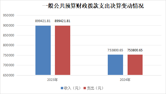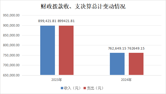 2024年度财政拨款收入、支出总计均为76.26万元。与2023年度相比,财政拨款收入总计、支出总计各减少13.68万元,下降15.21%。主要变动原因是严格落实党政机关过紧日子要求,办公费、差旅费、其他商品和服务支出等公用经费支出下降。
