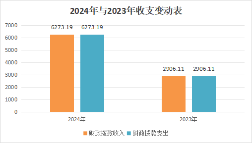 2024年度财政拨款收入、支出总计均为6273.19万元。与2023年度相比,财政拨款收入总计、支出总计各增加3367.08万元,增长53.67%。主要变动原因是项目经费增加,新增基础建设。