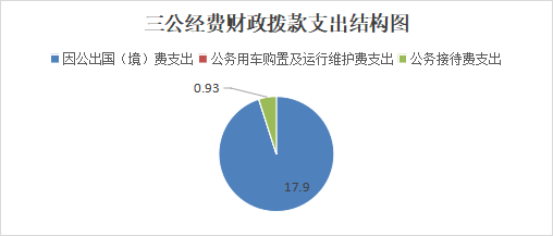 17.“三公”经费:指部门用财政拨款安排的因公出国(境)费、公务用车购置及运行费和公务接待费。其中,因公出国(境)费反映单位公务出国(境)的国际旅费、国外城市间交通费、住宿费、伙食费、培训费、公杂费等支出;公务用车购置及运行费反映单位公务用车车辆购置支出(含车辆购置税)及租用费、燃料费、维修费、过路过桥费、保险费等支出;公务接待费反映单位按规定开支的各类公务接待(含外宾接待)支出。