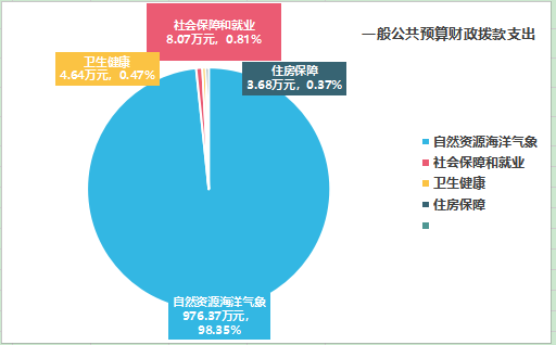 2024年度一般公共预算财政拨款支出992.76万元,主要用于以下方面:自然资源海洋气象等支出976.37万元,占98.35%;社会保障和就业支出8.07万元,占0.81%;卫生健康支出4.64万元,占0.47%;住房保障支出3.68万元,占0.37%。